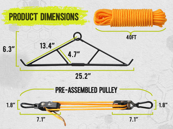 - 700 lbs heavy-duty deer hanger with pre-assembled 4:1 pulley and foldable frame.