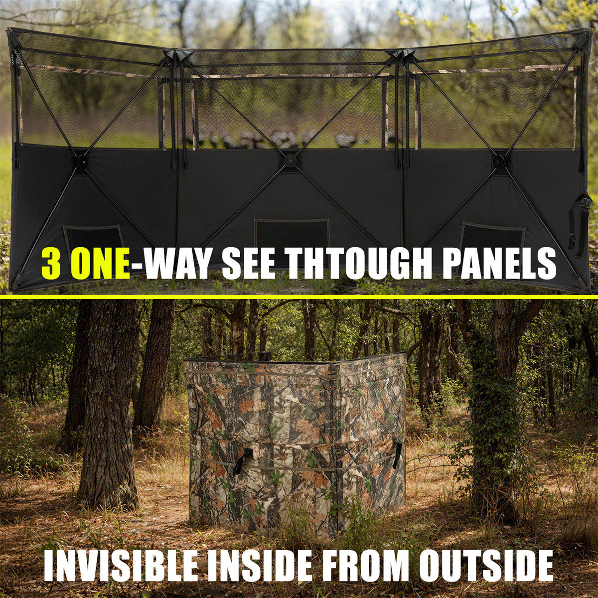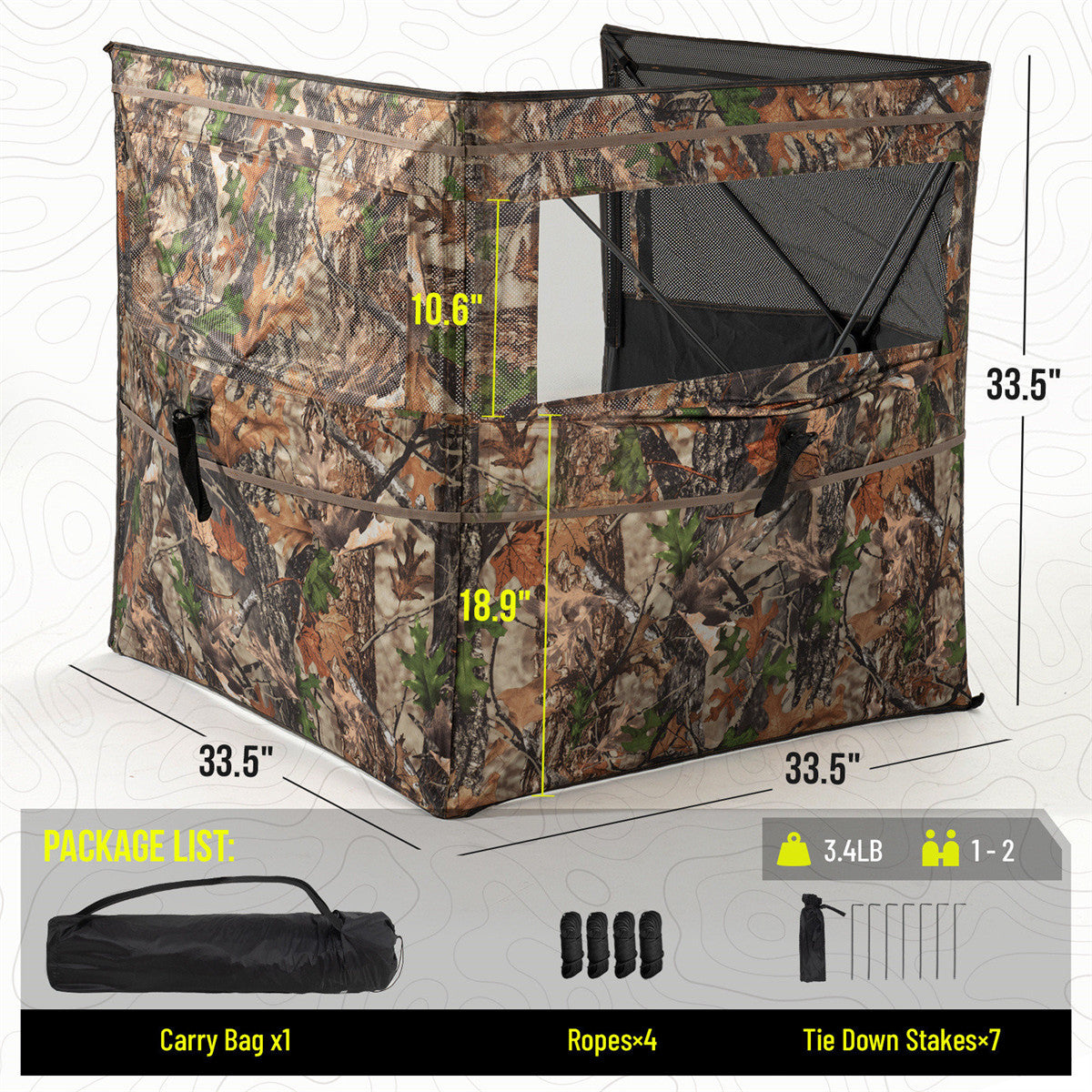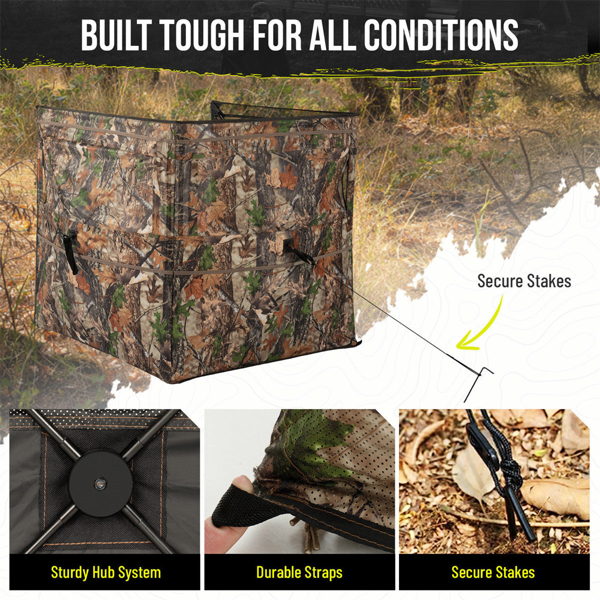 The hunting blind is made of high-quality polyester fabric, strong metal hubs, reinforced corners, and durable straps.
