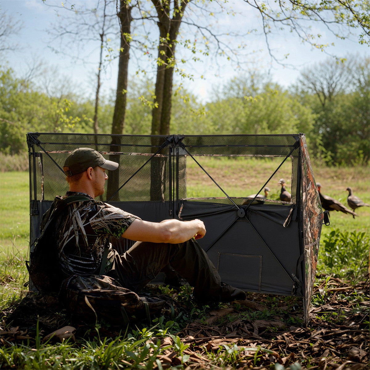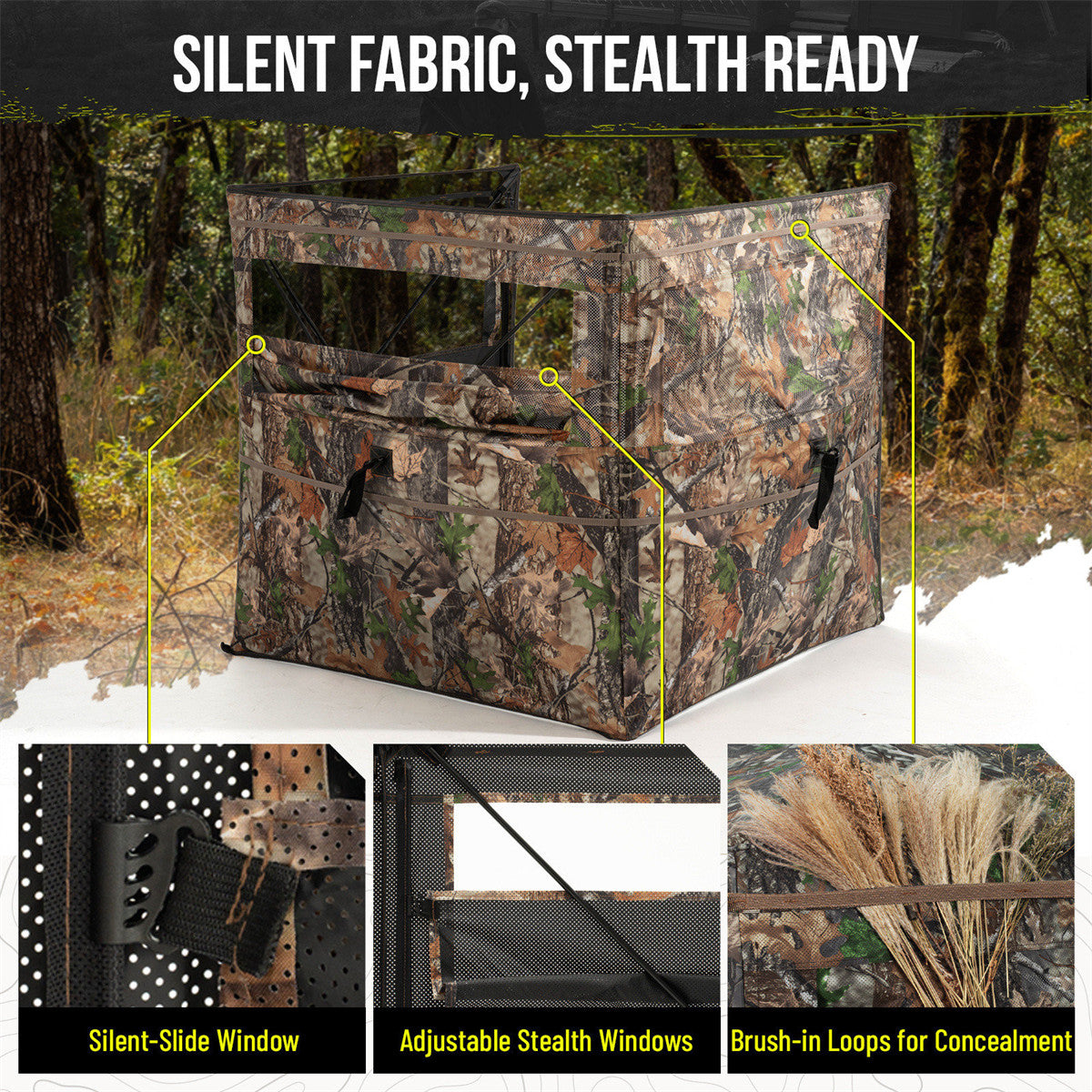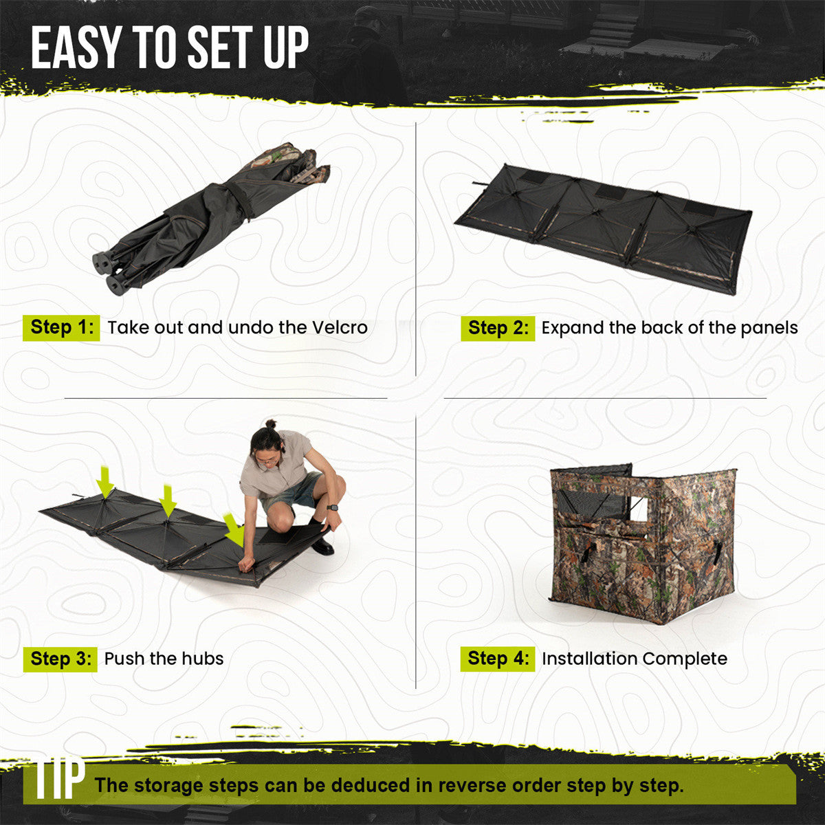 The hunting blind is made of high-quality polyester fabric, strong metal hubs, reinforced corners, and durable straps.