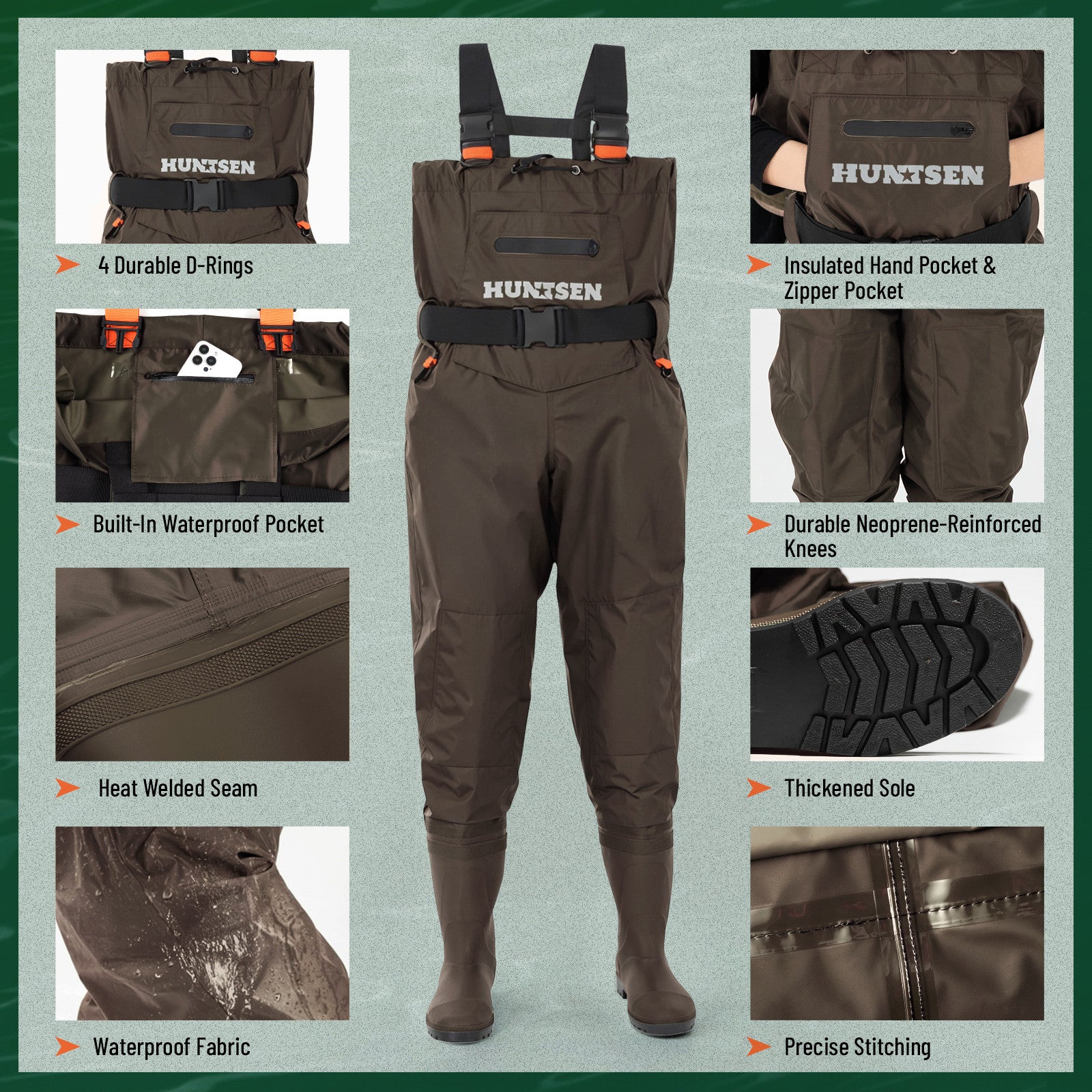 Built with PVC-coated nylon and fully taped seams, HUNTSEN fishing waders guarantee complete waterproof protection. Each pair is rigorously tested to keep you dry in marshes, rivers, or rainy fields.